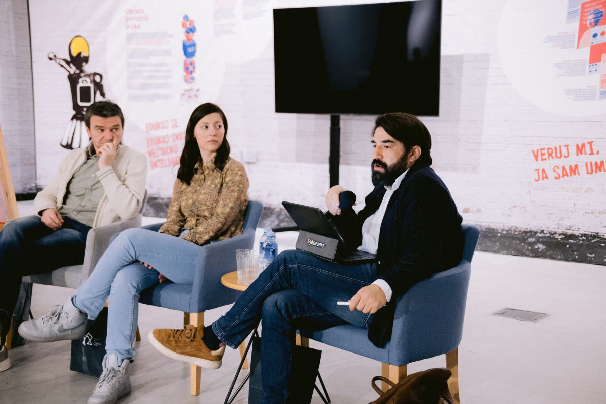 Dr Dragiša Mišković sa Istraživačko-razvojnog instituta za veštačku inteligenciju Srbije govorio je o istorijatu razvoja ove tehnologija i procesu treniraja velikih jezički modela poput ChatGPT-ja. Dr Vanja Subotić sa Instituta za filozofiju Filozozfskog fakulteta Univerziteta u Beoigradu osvrnula se na to koliko je razumevanje tehnologije obrade prirodnih jezika relevantno za razumevanje naših jezičkih sposobnosti.